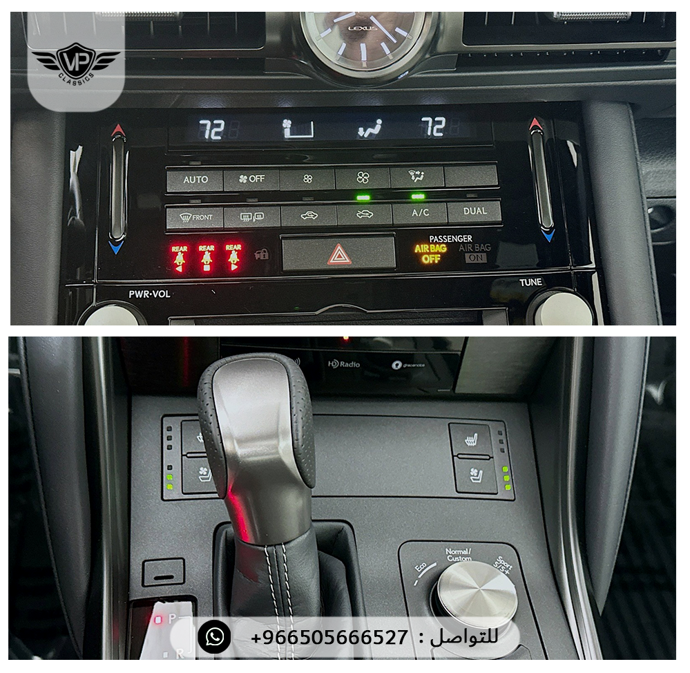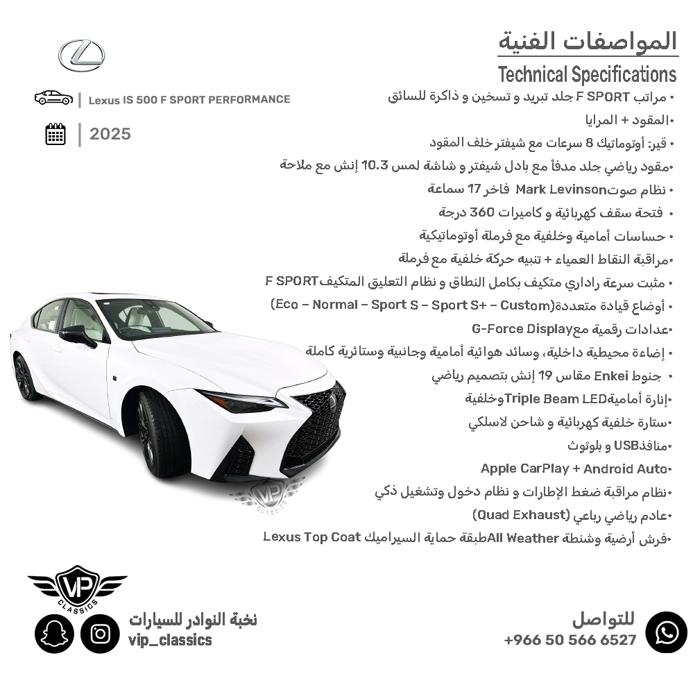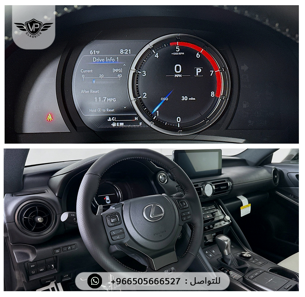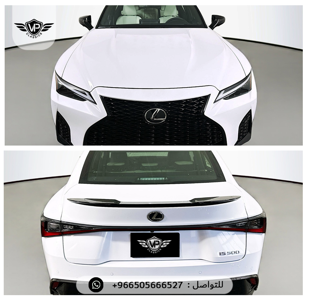 مراتب F SPORT جلد تبريد و تسخين، ذاكرة للسائق + المقود + المرايا، مقود رياضي جلد مدفأ مع بادل شيفتر، شاشة لمس 10.3 إنش مع ملاحة، نظام صوت Mark Levinson فاخر 17 سماعة /، فتحة سقف كهربائية، كاميرات 360 درجة + حساسات أمامية وخلفية مع فرملة أوتوماتيكية، مراقبة النقاط العمياء + تنبيه حركة خلفية مع فرملة، مثبت سرعة راداري متكيف بكامل النطاق، نظام التعليق المتكيف F SPORT، أوضاع قيادة متعددة (Eco – Normal – Sport S – Sport S+ – Custom)، عدادات رقمية مع G-Force Display، جنوط Enkei مقاس 19 إنش بتصميم رياضي، إنارة أمامية Triple Beam LED وخلفية LED، ستارة خلفية كهربائية، شاحن لاسلكي + منافذ USB، بلوتوث + Apple CarPlay + Android Auto، إضاءة محيطية داخلية، وسائد هوائية أمامية وجانبية وستائرية كاملة، نظام مراقبة ضغط الإطارات، نظام دخول وتشغيل ذكي، عادم رياضي رباعي (Quad Exhaust)، فرش أرضية وشنطة All Weather، طبقة حماية السيراميك Lexus Top Coat ✅