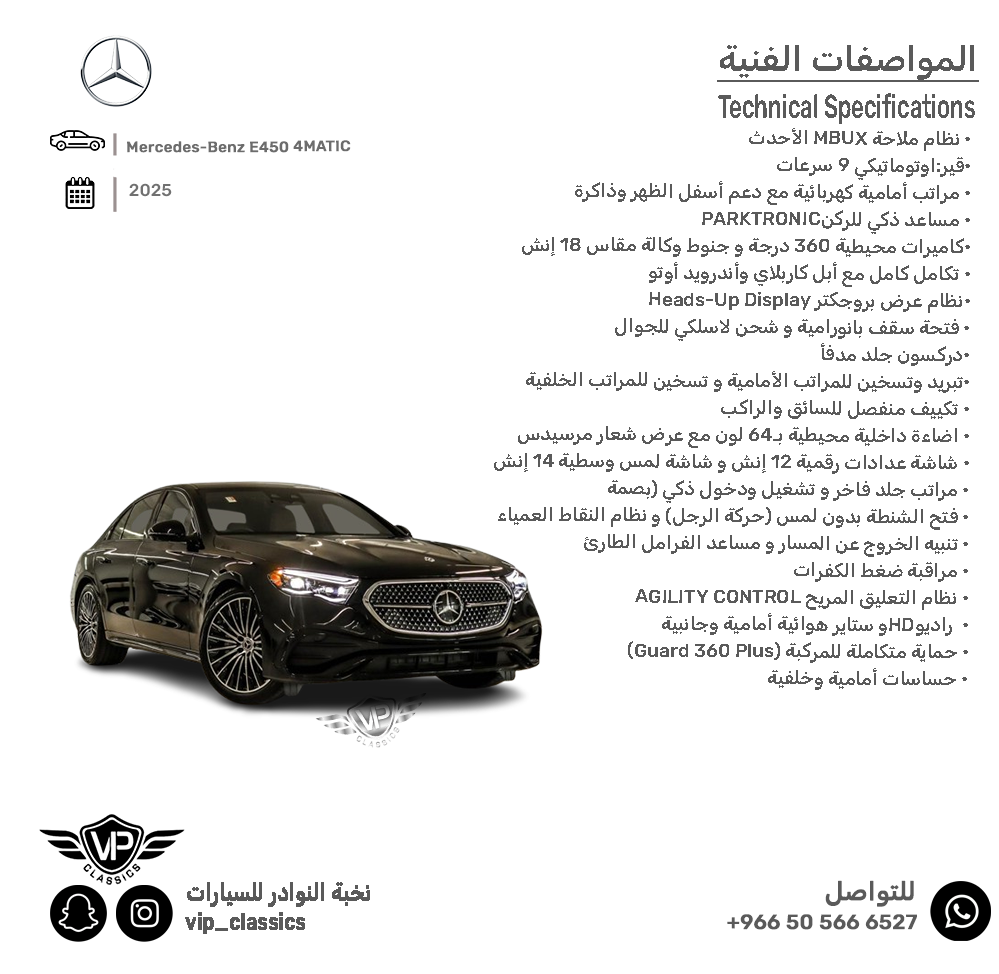 نظام ملاحة MBUX الأحدث ، مساعد ذكي للركن (PARKTRONIC)، نظام عرض بروجكتر (Heads-Up Display)، كاميرات محيطية 360 درجة، جنوط وكالة مقاس 18 إنش، تكامل كامل مع أبل كاربلاي وأندرويد أوتو، فتحة سقف بانورامية، شحن لاسلكي للجوال، دركسون جلد مدفأ، مراتب أمامية كهربائية مع دعم أسفل الظهر وذاكرة، تبريد وتسخين للمراتب الأمامية، تسخين للمراتب الخلفية، تكييف منفصل للسائق والراكب، إضاءة داخلية محيطية بـ64 لون مع عرض شعار مرسيدس، شاشة عدادات رقمية 12 إنش، شاشة لمس وسطية 14 إنش، مراتب جلد فاخر، تشغيل ودخول ذكي (بصمة)، فتح الشنطة بدون لمس (حركة الرجل)، نظام النقاط العمياء، تنبيه الخروج عن المسار، مساعد الفرامل الطارئ، مراقبة ضغط الكفرات، نظام التعليق المريح AGILITY CONTROL، حماية متكاملة للمركبة (Guard 360 Plus)، راديو HD، ستاير هوائية أمامية وجانبية، حساسات أمامية وخلفية، وغيرها الكثير من أنظمة الأمان والراحة ✅